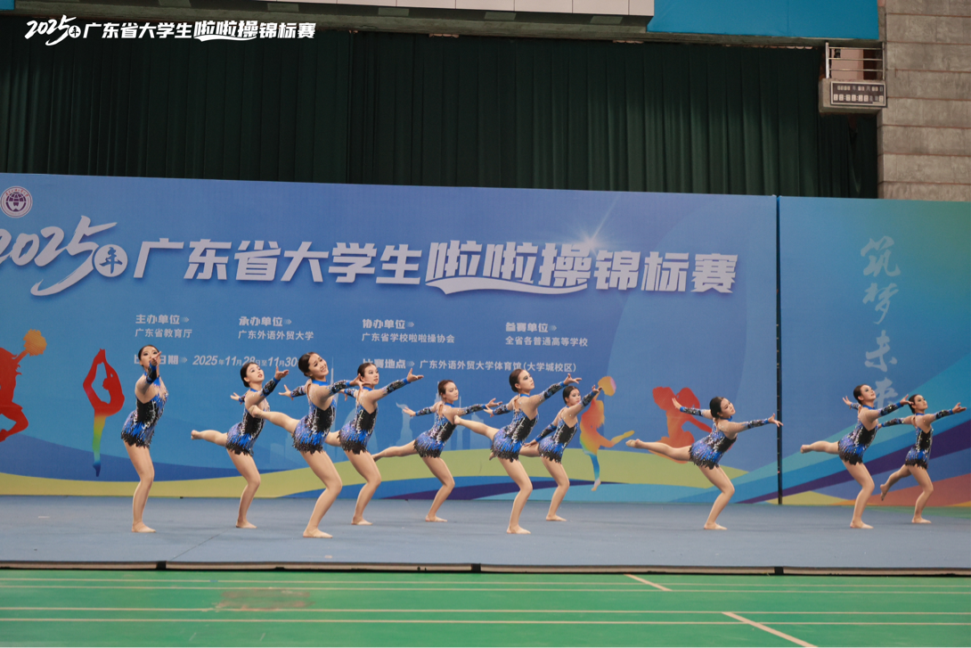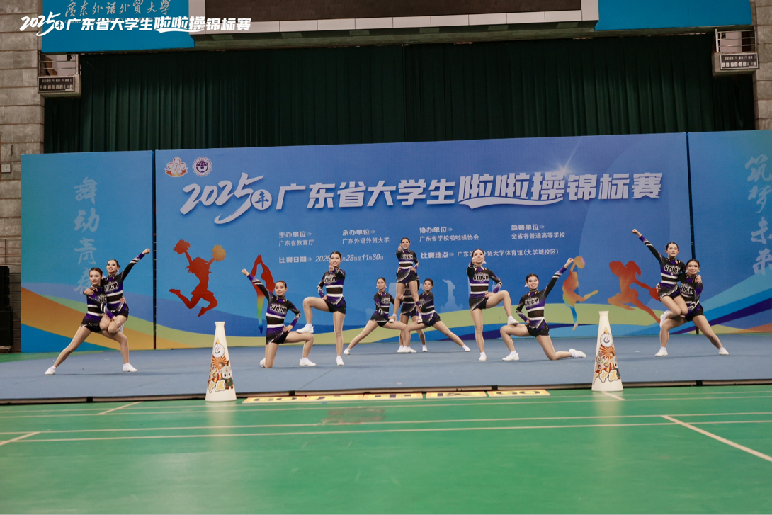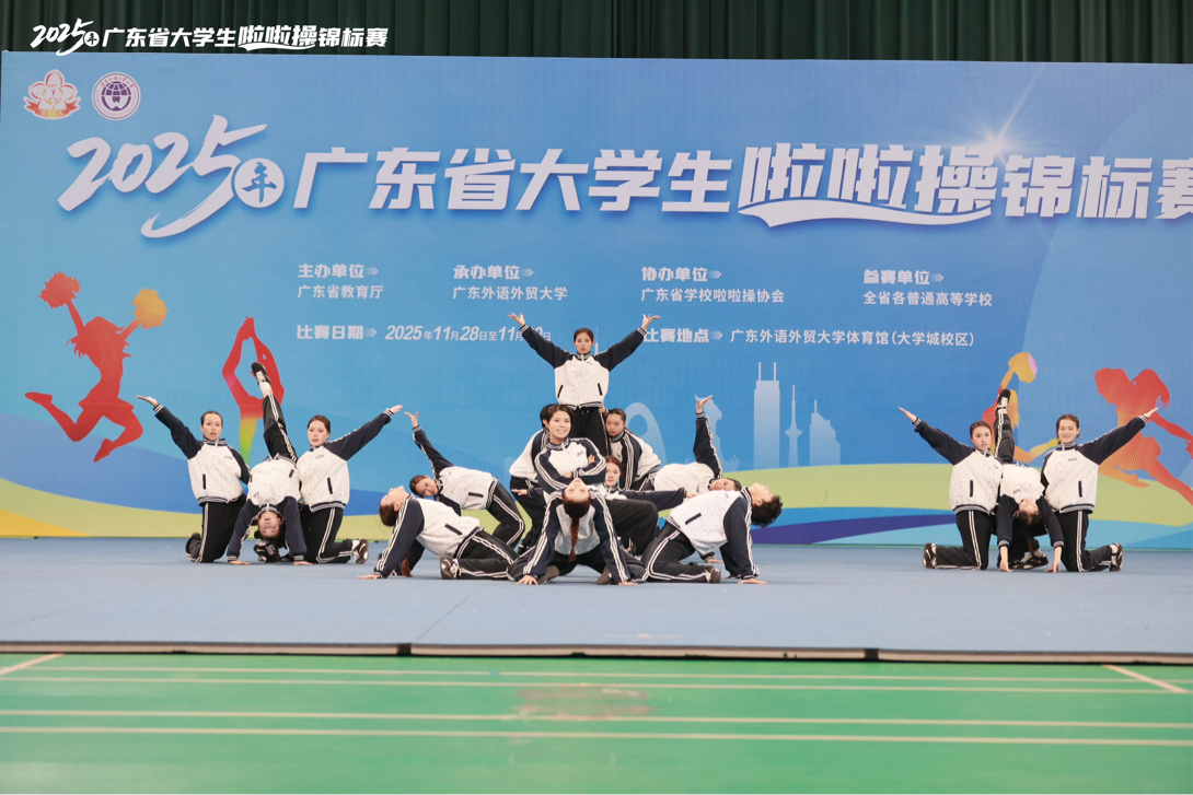 11月28日至30日,2025年广东省大学生啦啦操锦标赛在广东外语外贸大学火热开赛。来自全省多所高校的啦啦操队伍齐聚赛场,以活力与技巧展开激烈角逐。此次比赛,我校共派出了以体育健康学院李兆伟院长为领队,庞贤妹老师、马少辉老师、陈建新老师、陈荔老师为教练的72人代表团参赛。