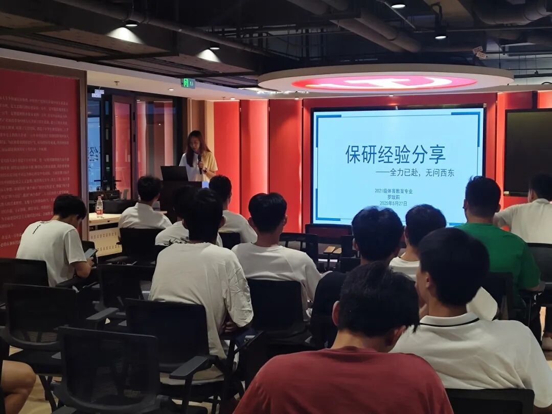 在此次分享会上,三位优秀学子分享自己的升学经验。罗玟莉作为国家奖学金与“校园年度人物”获得者,以学术成果与体育竞赛双优的经历,分享保研深圳大学的心得,强调综合能力的重要性;王伟初试379分上岸广州体育学院,从院校选择、学习方法、心态调整等方面传授备考策略,介绍了实用的学习资源;吴杰奎以381分考取华南师范大学,不仅分享高效备考技巧与复试流程,更结合实习经历,阐述实践对专业能力提升及面试的积极作用。